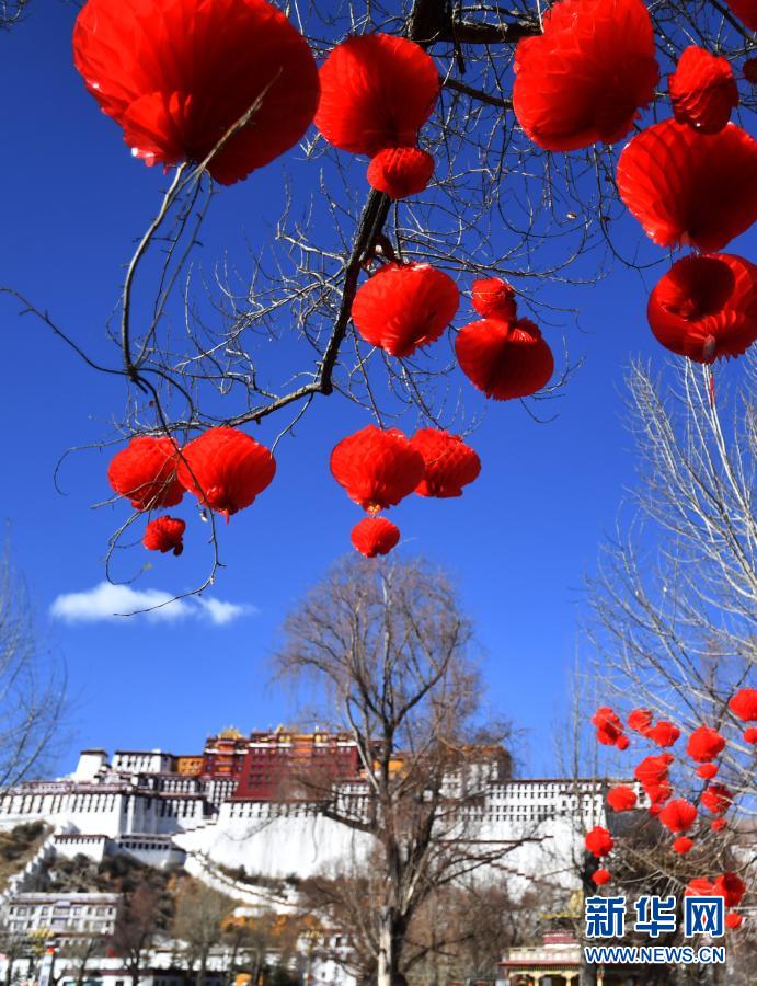 2月8日拍攝的布達(dá)拉宮前的大紅燈籠。新華社記者 覺果 攝