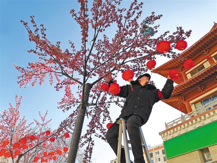 圖為2月8日,拉薩市藏游壇城物業(yè)工作人員在掛燈籠。陳振東 攝