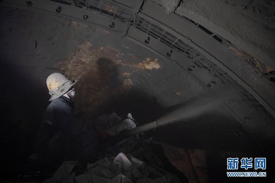 2月10日,在派墨公路老虎嘴隧道出口端,工作人員在進(jìn)行掛網(wǎng)噴混凝土作業(yè)。新華社記者 孫非 攝