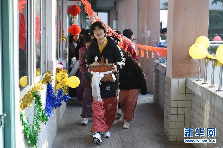 2月12日,合肥市第三十五中學西藏班的學生手捧祈福用的切瑪盒行走在校園內,給老師同學們拜年。新華社記者 周牧 攝