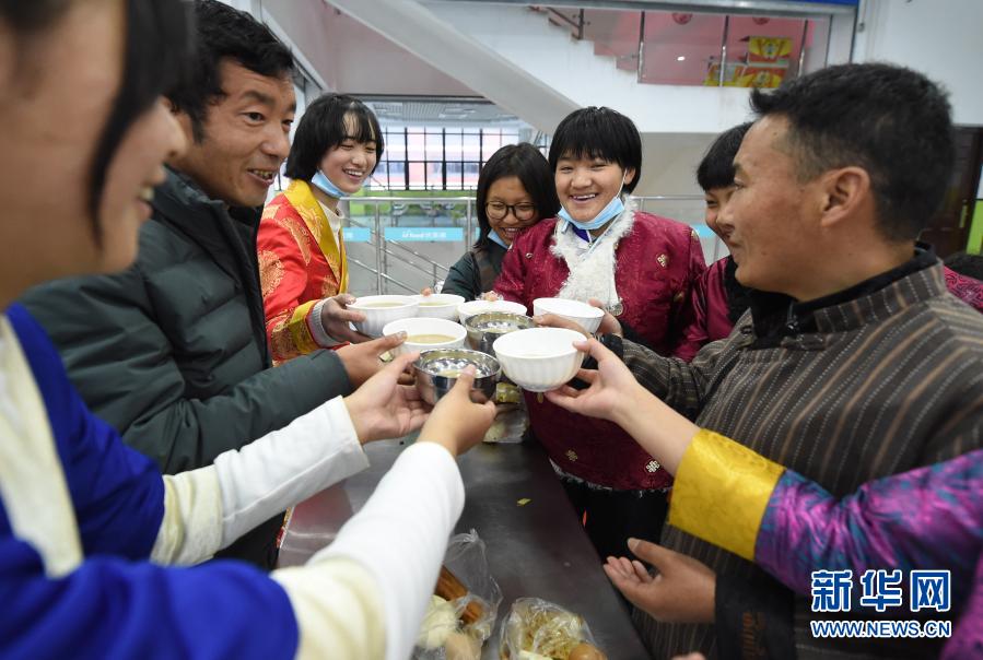 2月12日,合肥市第三十五中學西藏班的老師和學生們一起喝藏式甜茶慶祝藏歷新年和農歷春節(jié)。新華社記者 周牧 攝