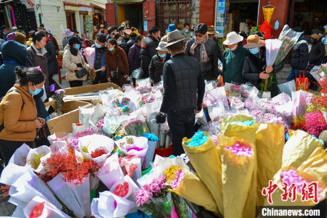 拉薩民眾在年貨市場購買鮮花。江飛波 攝