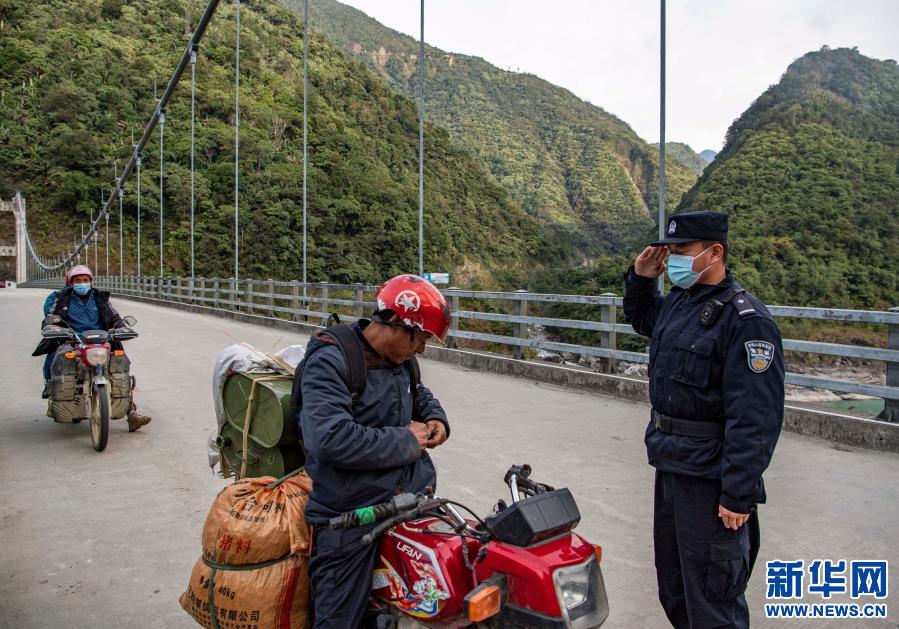 在三代解放大橋上,西藏林芝邊境管理支隊(duì)墨脫大隊(duì)背崩邊境派出所的民警在檢查過(guò)往車輛和人員(2月10日攝)。新華社記者 孫非 攝