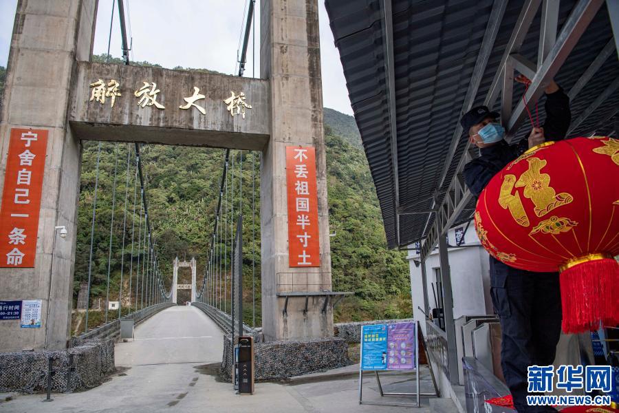 在解放大橋執(zhí)勤點(diǎn),西藏林芝邊境管理支隊(duì)墨脫大隊(duì)背崩邊境派出所的民警在懸掛紅燈籠(2月10日攝)。新華社記者 孫非 攝