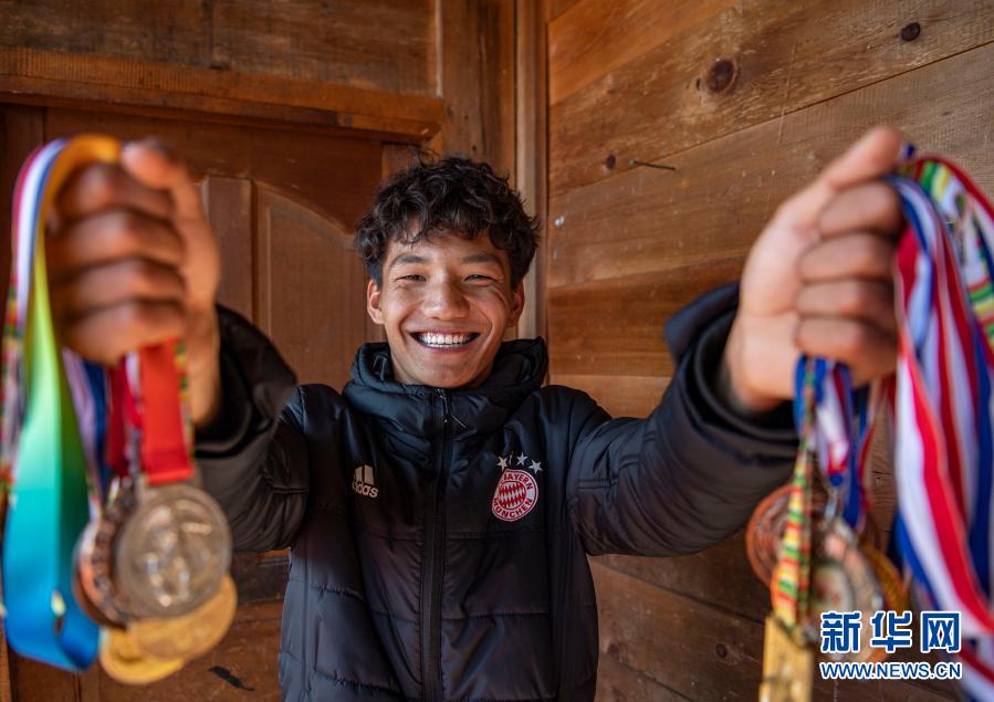 在位于西藏林芝市墨脫縣德興鄉(xiāng)巴登則村的家中,旺前羅布展示自己獲得的獎(jiǎng)牌(2月9日攝)。新華社記者 孫非 攝