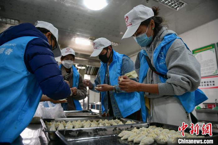 圖為青年志愿者在為福利院老人包餃子?!∝暩聛硭伞z