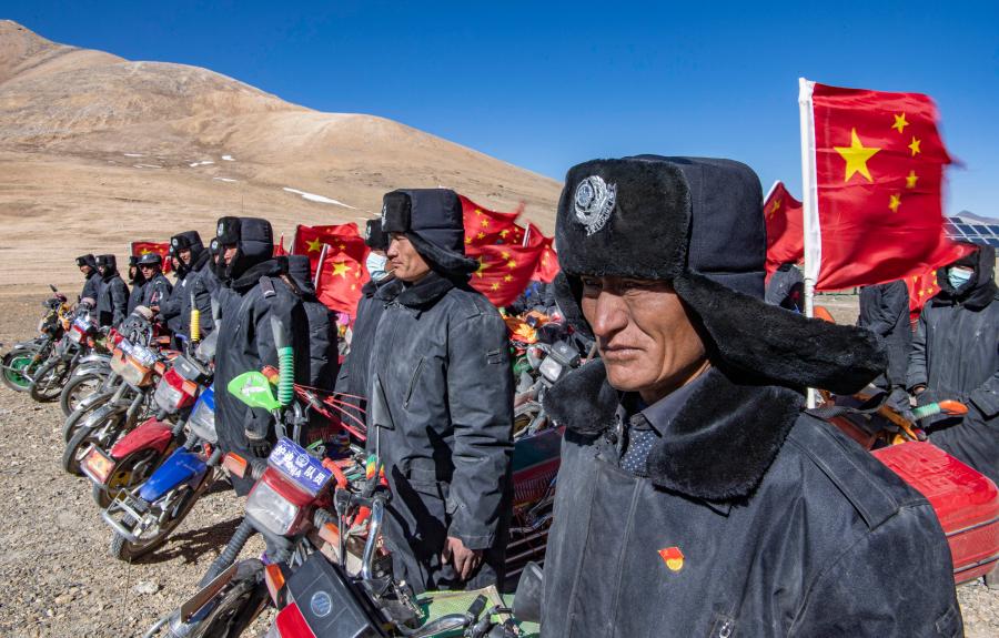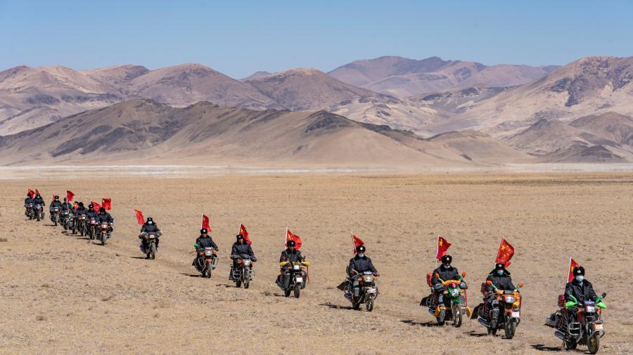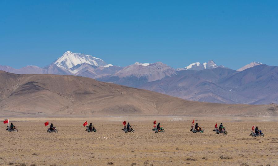 西藏日喀則市薩嘎縣昌果鄉(xiāng)的一處村莊里,48歲的藏族漢子石覺塔布在風(fēng)中跨上一輛摩托車,向平坦無垠的高原邊緣騎去。他的車尾插著一面五星紅旗,被風(fēng)吹得獵獵作響,即便駛出很遠,那抹紅色在車輪卷起的煙塵中也依然醒目。