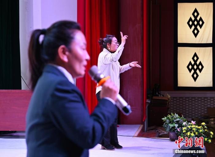 圖為3月11日,拉薩市人民檢察院未成年檢察廳負(fù)責(zé)人普布倉覺在做法治宣講,拉薩市特殊教育學(xué)校的手語老師為聾啞學(xué)生翻譯。 中新社記者 趙朗 攝