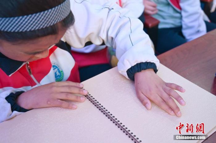圖為3月11日,拉薩市特殊教育學(xué)校的學(xué)生讀盲文法律宣傳手冊(cè)。中新社記者 趙朗 攝