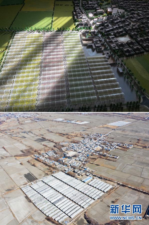 拼版照片的上圖是西藏山南市乃東區(qū)克松社區(qū)農(nóng)業(yè)產(chǎn)業(yè)生產(chǎn)基地規(guī)劃沙盤(2月9日攝);下圖是克松社區(qū)農(nóng)業(yè)產(chǎn)業(yè)生產(chǎn)基地(2月9日攝,無人機照片)。新華社記者 普布扎西 攝