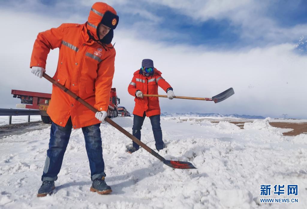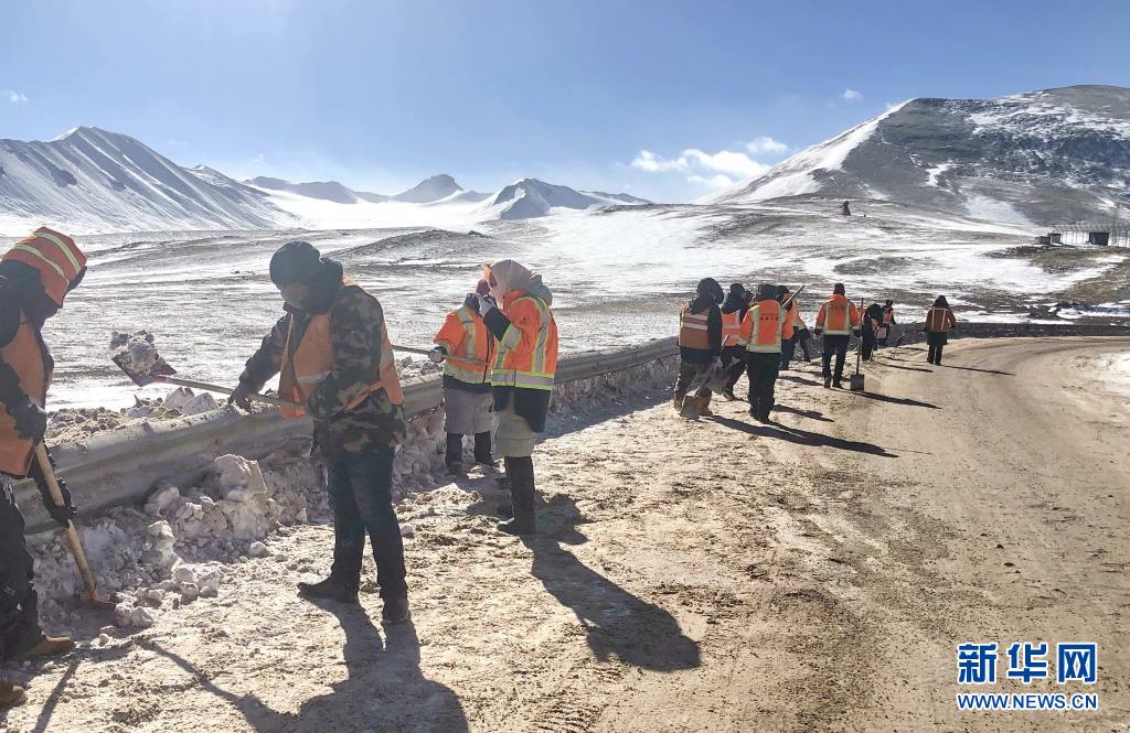 在國(guó)道109線K3363路段,安多公路養(yǎng)護(hù)段工作人員進(jìn)行除雪除冰作業(yè)(2020年3月11日攝)。新華社發(fā)(后耀軍 攝)