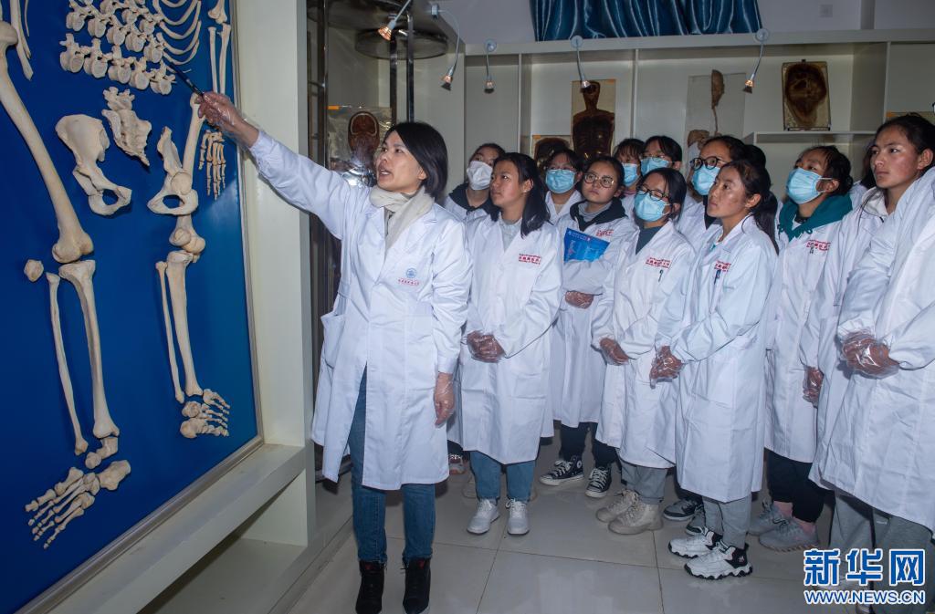 西藏藏醫(yī)藥大學藏醫(yī)系現(xiàn)代醫(yī)學教研室宗詠花老師在講解人體骨骼構造(3月23日攝)。新華社記者 旦增尼瑪曲珠 攝