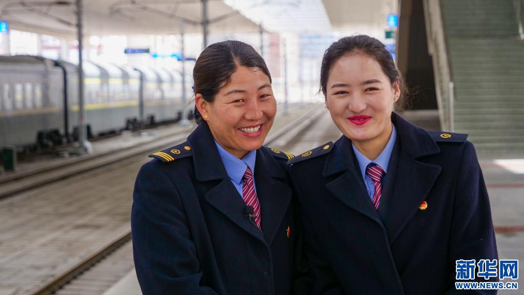 斯朗卓瑪(左)和同事在拉薩火車(chē)站合影(3月22日攝)。新華社記者 旦增尼瑪曲珠 攝