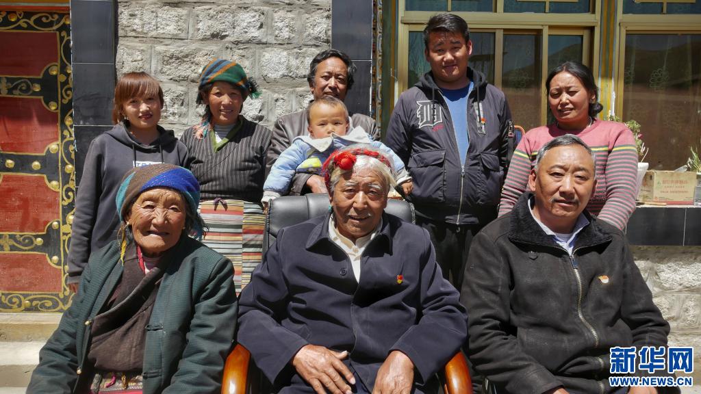 頓珠旺杰(前中)和家人的合影(4月5日攝)。新華社記者 孫陽 攝