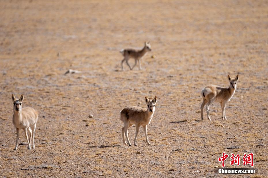 “五一”小長(zhǎng)假,中新網(wǎng)記者沿省干線公路自駕西藏自治區(qū)那曲羌塘草原腹地雙湖縣、申扎縣及班戈縣等地,看到當(dāng)?shù)夭亓缪颉⒉匾绑H、藏原羚等成群覓食。羌塘草原平均海拔4500多米,對(duì)人類而言氣候條件惡劣,但動(dòng)物們卻將此作為“天堂”。圖為5月3日,西藏班戈縣草原上的4只藏原羚,當(dāng)?shù)啬撩穹Q為黃羊。江飛波 攝