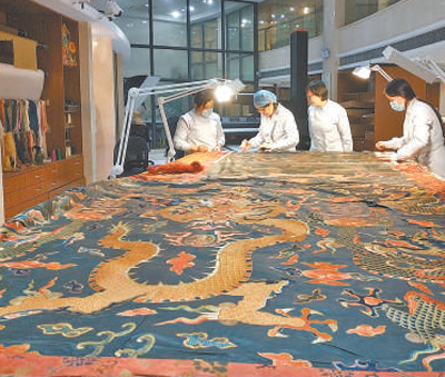 圖為中國(guó)絲綢博物館的修復(fù)團(tuán)隊(duì)在拉薩修復(fù)文物。