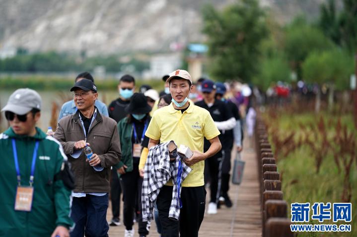 圖為在西藏拉薩市拉魯濕地的健身步道上,正在參加“2020年環(huán)拉魯濕地健步走系列活動”的選手們(2020年9月5日攝)。新華社記者 詹彥 攝