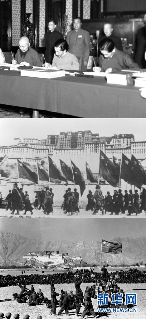 這是一張拼版照片:上圖為1951年5月23日,中央人民政府與西藏地方政府在北京簽訂《關(guān)于和平解放西藏辦法的協(xié)議》(簡稱“十七條協(xié)議”)。上圖為西藏地方政府代表在協(xié)議上簽字;中圖為1951年10月26日,西藏地方政府為人民解放軍舉行了隆重的入城式,拉薩古城飄揚著五星紅旗;下圖為西藏和平解放后,人民解放軍與藏族群眾在布達拉宮前歡度新年。
