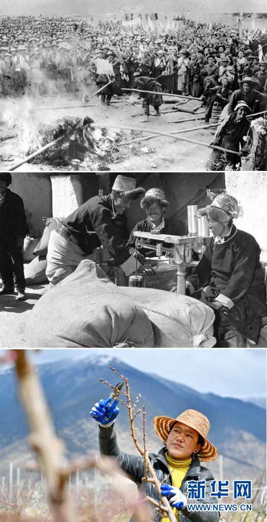 這是一張拼版照片:上圖為1959年8月,西藏墨竹工卡縣的翻身農(nóng)奴焚燒三大領主的剝削文契(新華社發(fā));中圖為1984年,江孜縣農(nóng)民洛桑旺堆(左)向國家出售余糧。他家承包土地100多畝,農(nóng)忙種地,農(nóng)閑搞建筑、跑運輸(新華社記者土登攝);下圖為2020年3月22日,西藏林芝現(xiàn)代蘋果標準化示范園的工作人員為桃樹剪枝。該示范園實施農(nóng)機農(nóng)藝結(jié)合、水肥一體化及“果草畜循環(huán)”,大面積推廣蘋果矮砧集約高效栽培技術(shù),帶動米林縣羌納鄉(xiāng)林巴、才巴、色沃村及附近的農(nóng)戶增收(新華社記者 張汝鋒 攝)。新華社發(fā)