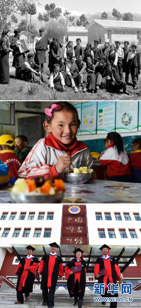 這是一張拼版照片:上圖為拉薩中學的應屆畢業(yè)生在校園里練歌,準備參加畢業(yè)典禮(新華社記者任用昭攝);中圖為一名藏族女孩在西藏雙湖縣嘎措鄉(xiāng)小學內(nèi)享受“三包”(包吃、包住、包學習費用)政策(2014年6月29日新華社記者普布扎西攝);下圖為2017年11月10日,西藏大學舉行首屆博士研究生畢業(yè)典禮,向4名畢業(yè)生授予博士學位。這4名博士分別來自藏族歷史專業(yè)、藏語言文學專業(yè)及高原醫(yī)學專業(yè)(新華社記者覺果攝)。新華社發(fā)