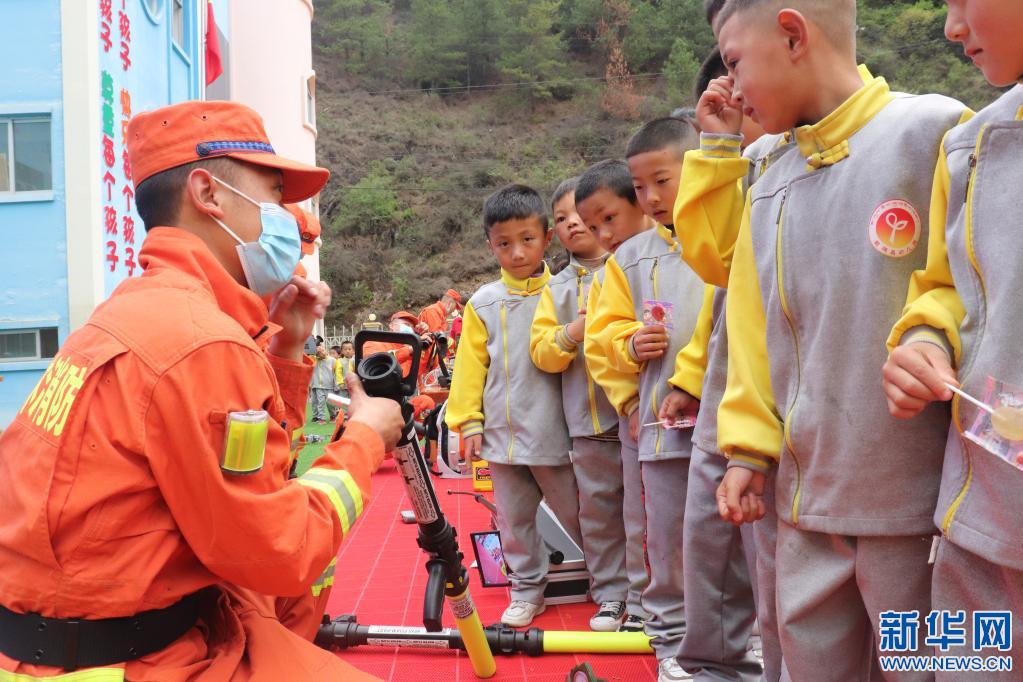 察隅縣森林消防員向?qū)W生介紹滅火裝備。張琳攝
