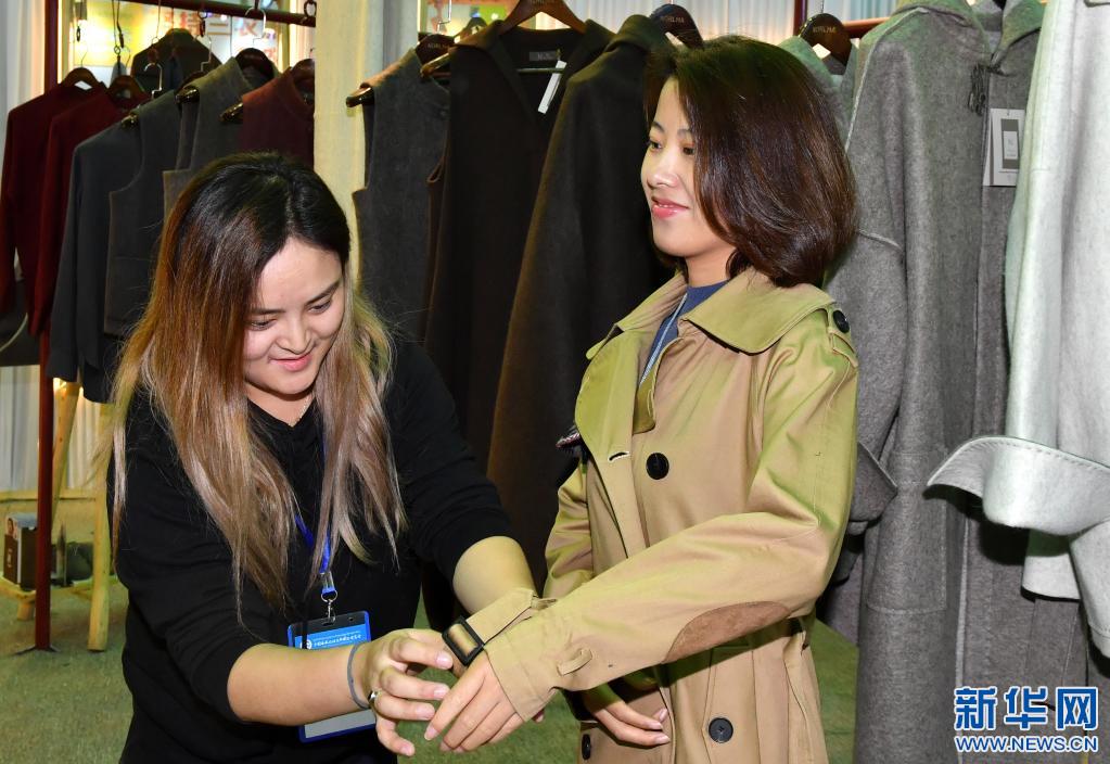 顧客在藏博會(huì)上試穿當(dāng)?shù)禺a(chǎn)的服裝(2018年9月8日攝)。 新華社記者 覺果 攝
