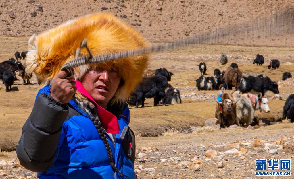 在西藏日喀則市定日縣扎西宗鄉(xiāng)藏普村的牧場(chǎng)里,牧民扎西正在趕牦牛(2020年4月23日攝)。新華社記者 孫非 攝