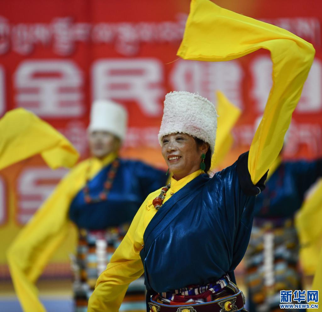 圖為2020年8月8日,2020年西藏自治區(qū)“全民健身日”活動啟動儀式在拉薩舉行的活動現(xiàn)場,“龍王潭羌塘鍋莊林”健身隊(duì)在啟動儀式上表演那曲鍋莊串燒。新華社記者 晉美多吉 攝