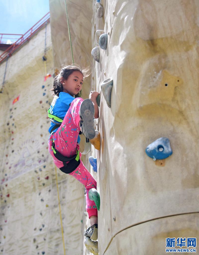 2017年5月,全運(yùn)會群眾性項(xiàng)目西藏攀巖資格賽在拉薩舉行,圖為少年組小選手丹喬央宗在攀爬。新華社記者 晉美多吉 攝