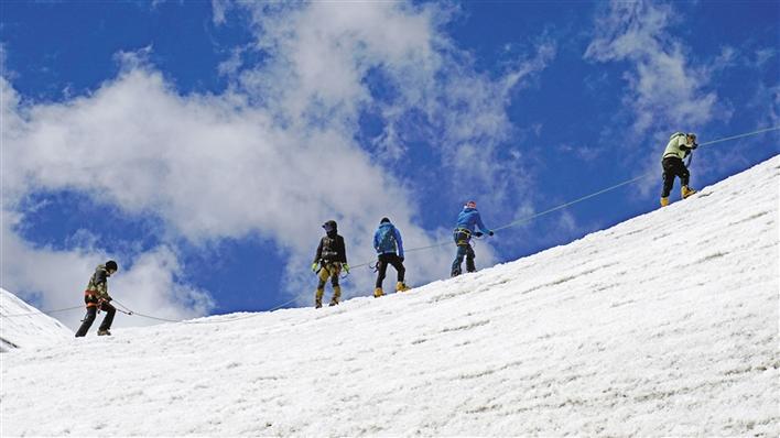 壓題圖片為洛堆峰登山探險活動中,登山愛好者在5400米雪線處進行冰雪和登山技術(shù)訓練。記者 鄭璐 張姝 攝