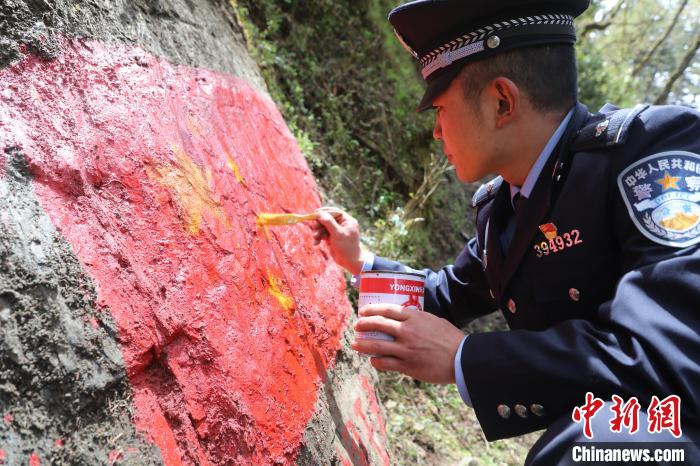 圖為玉麥邊境派出所移民管理警察在邊境一線對國旗、中國字樣等主權(quán)標(biāo)志物描紅。山南邊境管理支隊供圖
