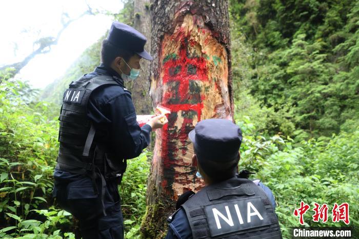 圖為三安曲林邊境派出所移民管理警察在邊境山口噴繪主權(quán)標(biāo)志物。山南邊境管理支隊供圖