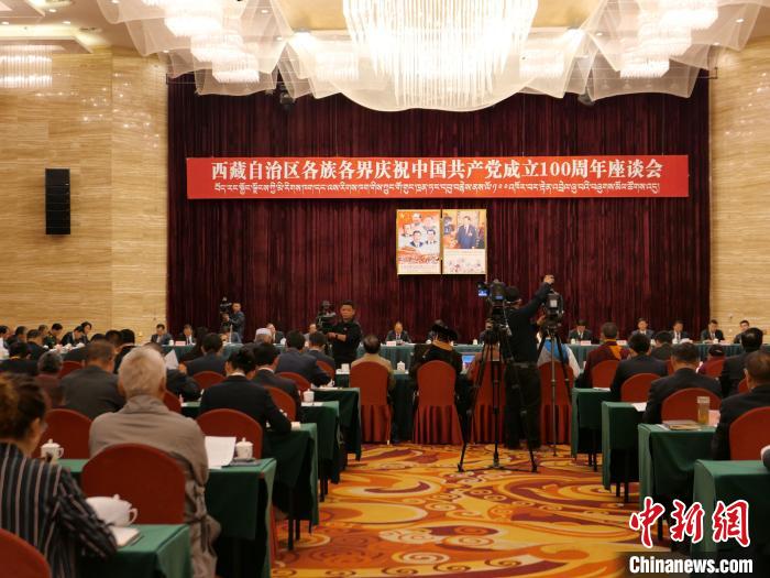 圖為西藏自治區(qū)各族各界慶祝中國(guó)共產(chǎn)黨成立100周年座談會(huì)現(xiàn)場(chǎng)。謝牧 攝