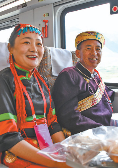 6月25日10時(shí)30分,一輛復(fù)興號(hào)高原內(nèi)電雙源動(dòng)車組駛出拉薩火車站,駛向林芝市。圖為乘坐復(fù)興號(hào)的乘客。新華社記者 晉美多吉攝