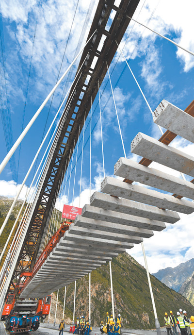 2020年9月20日,中鐵十一局工程技術(shù)人員在拉林鐵路藏木特大橋上鋪軌。新華社記者 覺 果攝