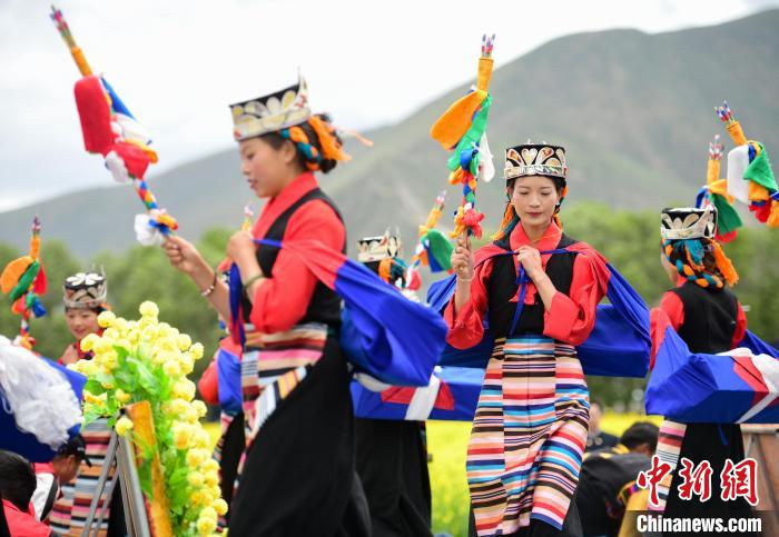 圖為西藏自治區(qū)拉薩市墨竹工卡縣小油菜花文化旅游節(jié)表演舞蹈《田間歡歌》。貢嘎來(lái)松 攝