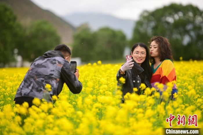 圖為游客在油菜花海里拍照留念。貢嘎來(lái)松 攝