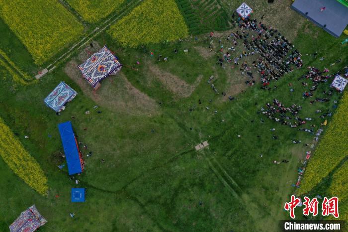 圖為西藏自治區(qū)拉薩市墨竹工卡縣小油菜花文化旅游節(jié)現(xiàn)場(chǎng)。(無(wú)人機(jī)拍照)貢嘎來(lái)松 攝
