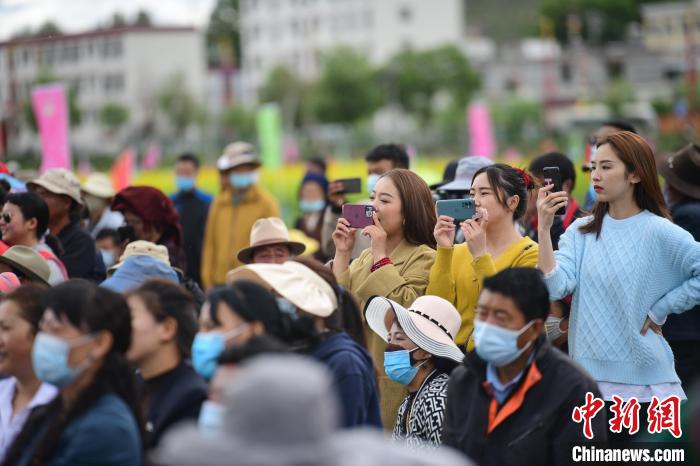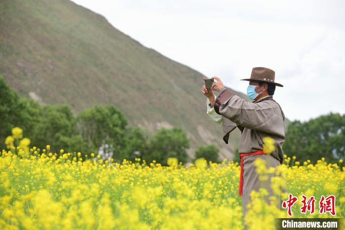 圖為西藏自治區(qū)拉薩市墨竹工卡縣小油菜花文化旅游節(jié)現(xiàn)場(chǎng)游客拿出手機(jī)拍攝節(jié)目。貢嘎來(lái)松 攝