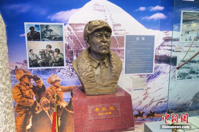 近日,中新社記者隨采訪團重走上世紀(jì)50年代中國人民解放軍進(jìn)藏先遣連的入藏路線。圖為南疆軍區(qū)某合成團1連榮譽室,雕像是進(jìn)藏先遣英雄連總指揮李狄三。 中新社記者 楊程晨 攝