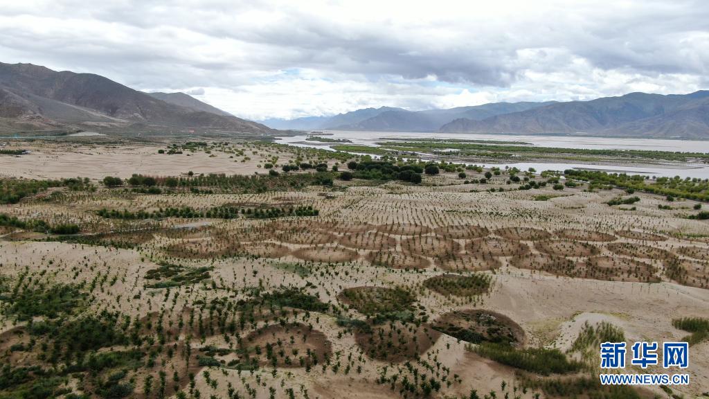 雅魯藏布江山南段沙丘上的人工林(7月20日攝,無人機(jī)照片)。新華社記者 晉美多吉 攝