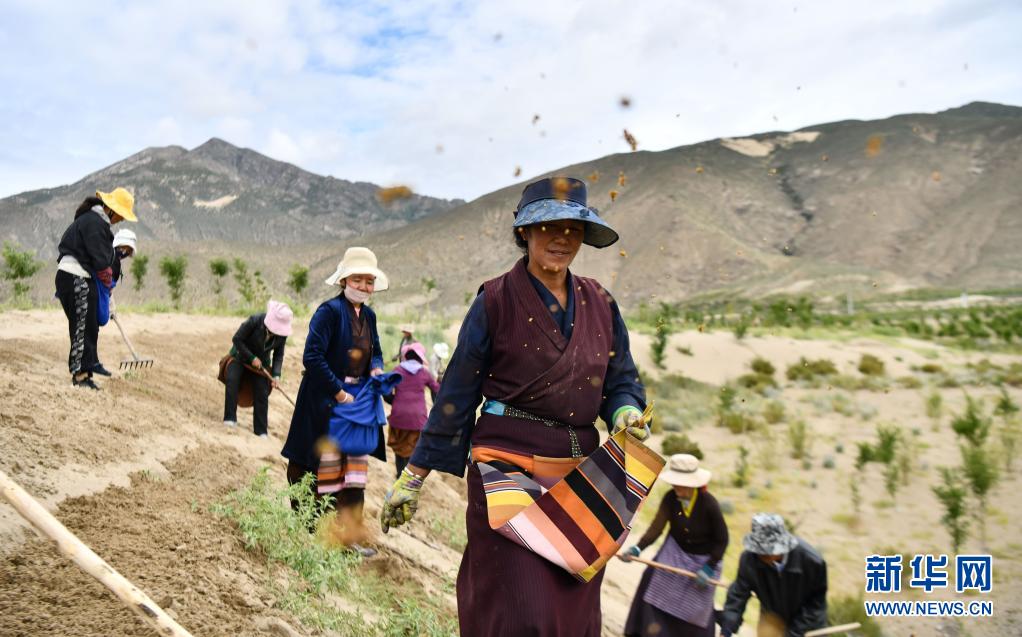在山南市全國防沙治沙綜合示范區(qū),當(dāng)?shù)厝罕娫谏车厣显苑N樹苗(7月20日攝)。新華社記者 晉美多吉 攝