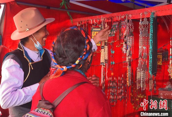 圖為一對(duì)藏族夫婦在打隆物交會(huì)上選購(gòu)飾品。冉文娟 攝