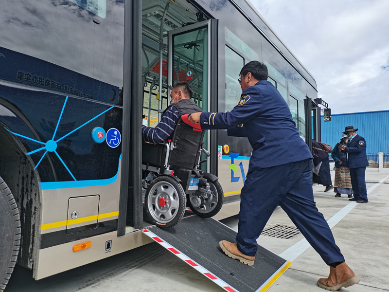 3日,拉薩市公交運(yùn)營(yíng)有限公司舉行拉薩公交經(jīng)開區(qū)B區(qū)公交首末站啟用暨大站快線開通儀式?,F(xiàn)場(chǎng),坐在輪椅上的市民覺列準(zhǔn)備乘坐新公交車,駕駛員接到乘車提示后,采取制動(dòng)措施,將車輛熄火后來(lái)到后門處,將無(wú)障礙踏板翻開并固定好,順利幫其上車。