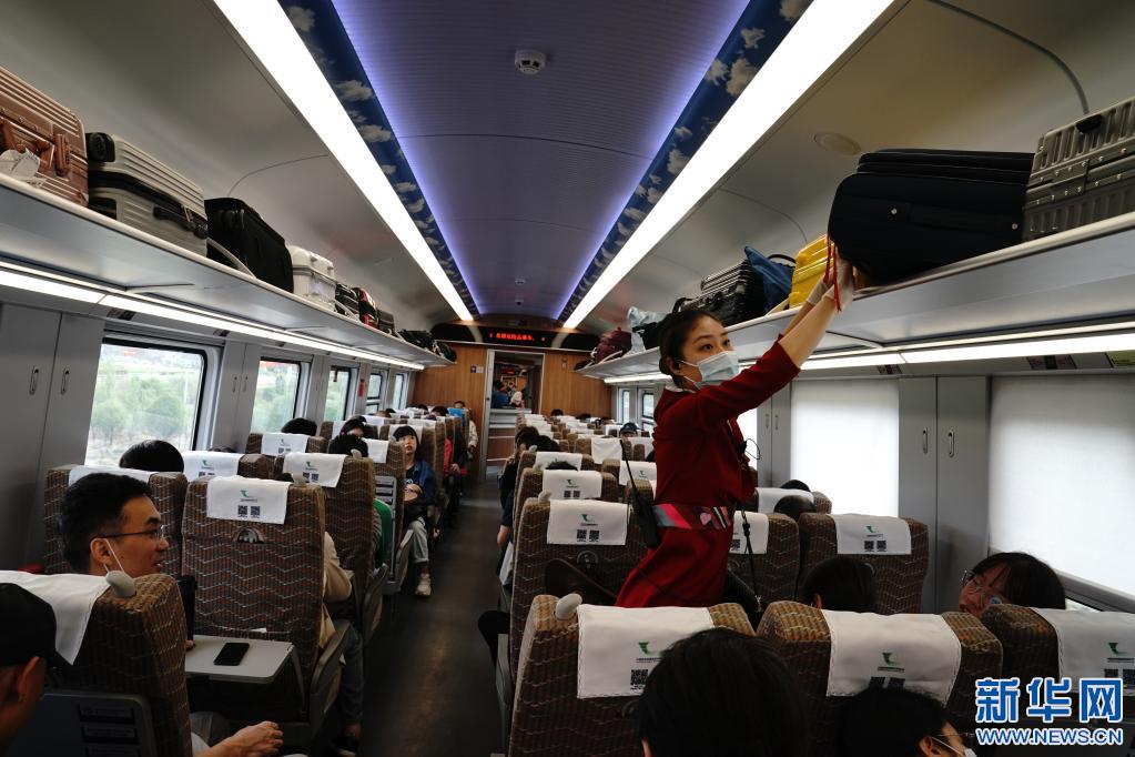 拉林鐵路復興號列車乘務(wù)員正在為旅客整理行李(2021年7月8日攝)。新華社記者 劉洪明 攝