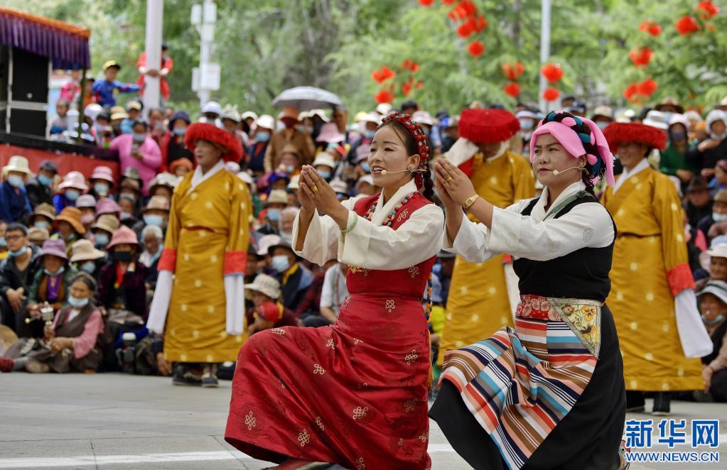 拉薩市堆龍德慶區(qū)馬鄉(xiāng)措麥村民間藏戲隊正在表演藏戲。(2021年6月12日攝) 新華社記者 張汝鋒 攝