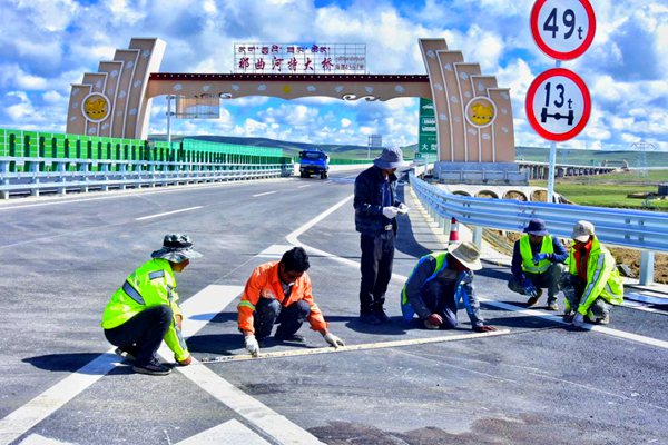 工人在畫路標(biāo)。人民網(wǎng) 李海霞攝