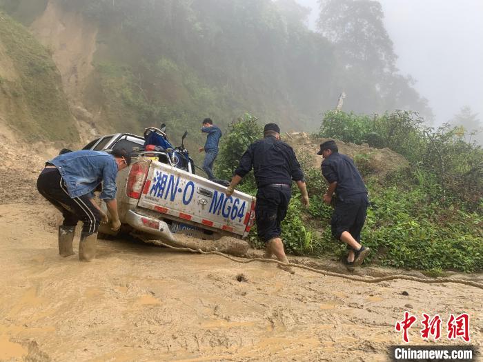 同時,參加救援的民警對斜坡進(jìn)行加固,預(yù)防雨水沖刷下來的碎石、樹枝等雜物造成次生災(zāi)害。其余民警則徒手挖泥,搬碎石,將車輛從水渠處墊高,用牽引繩迅速將被困車輛從塌陷處拽出來,整個過程,民警們頭頂大雨,腳踩淤泥,他們以實際行動踐行著移民管理警察的初心和使命。