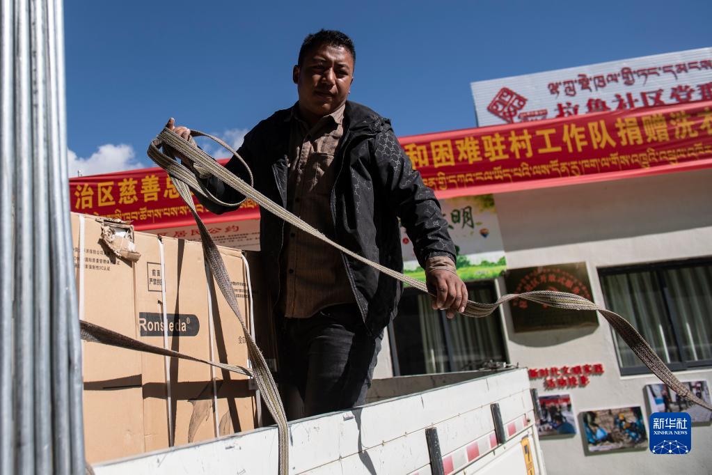 9月7日,拉薩市墨竹工卡縣貼朗村駐村工作隊隊員楊愛軍(右)和當雄縣加多村駐村工作隊隊員拉平查收全自動洗衣機。新華社記者 孫瑞博 攝