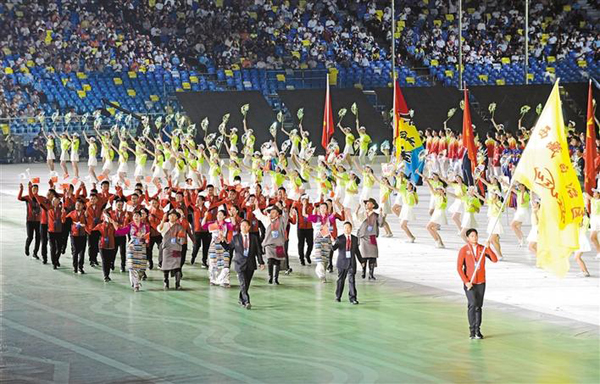 9月15日晚,西藏自治區(qū)體育代表團在入場儀式上。潘多 王莉 攝